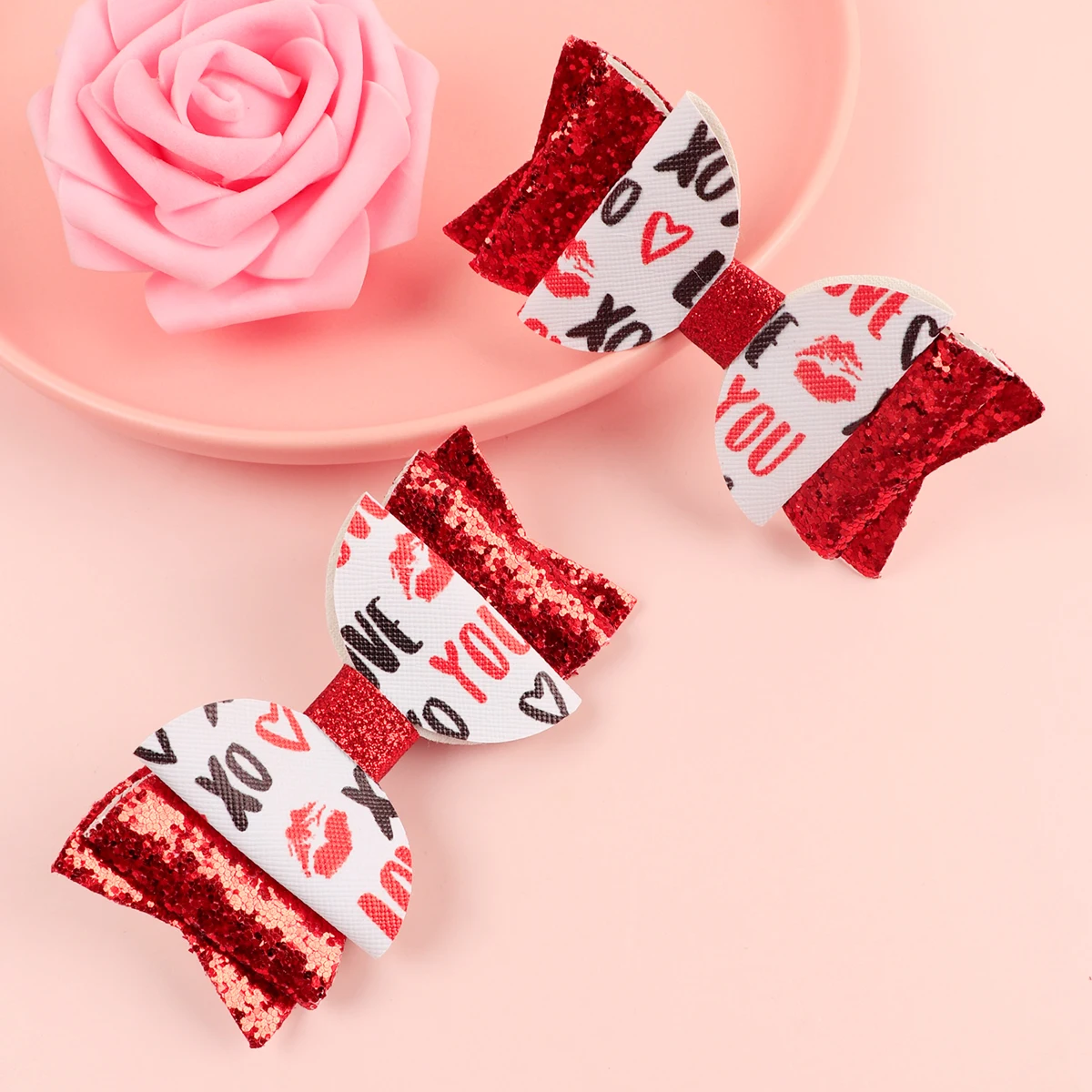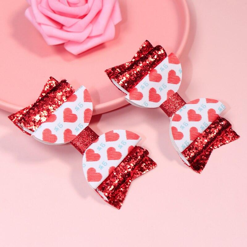Our hair clips are crafted from high-quality Polyester and Alloy, ensuring durability and long-lasting wear. The vibrant glitter PU leather bowknots, adorned with a charming heart pattern, are designed to catch the light and eyes of those around you. With their fashion-forward design, these hairpins are not just accessories but a statement of style.
