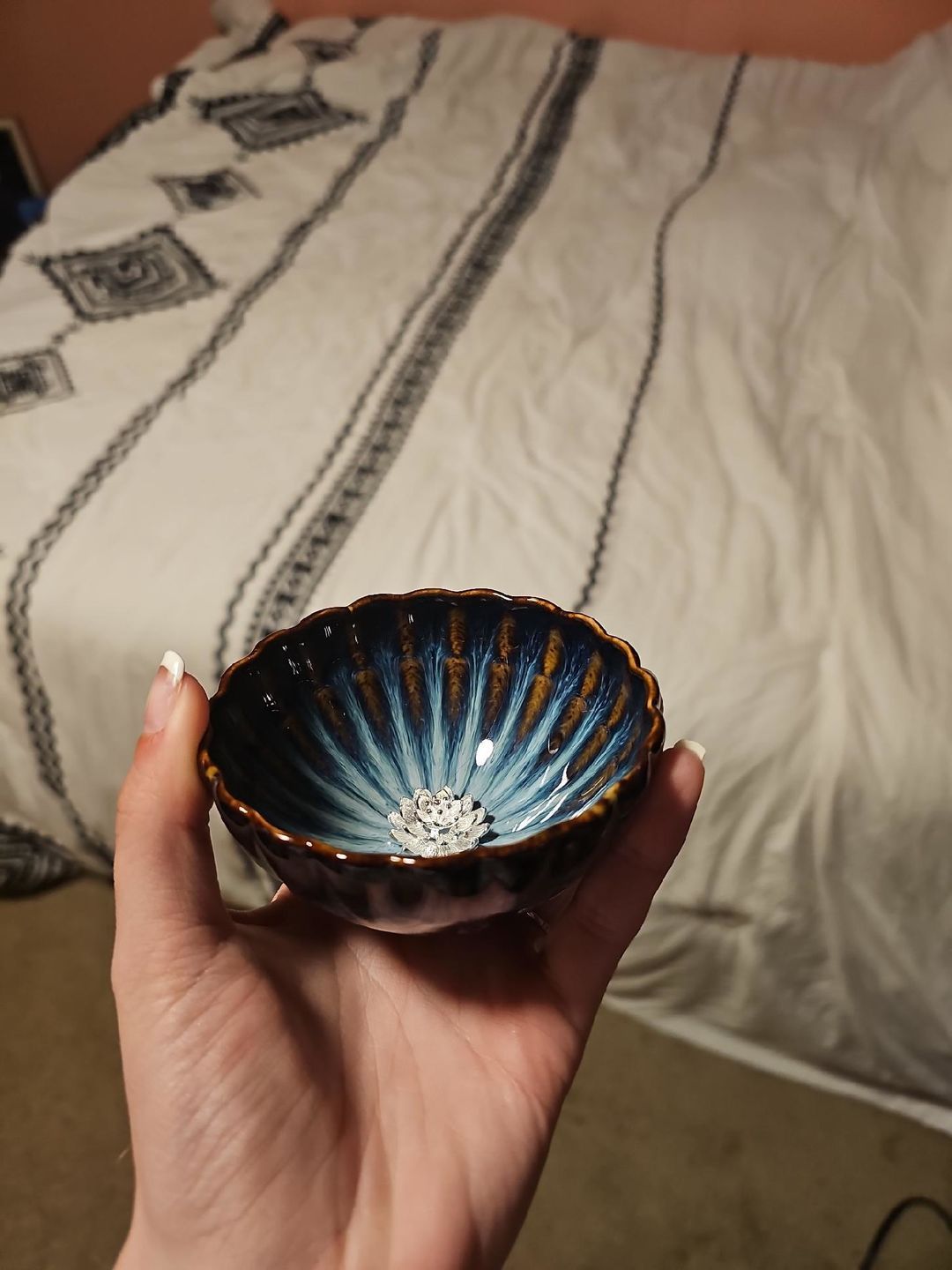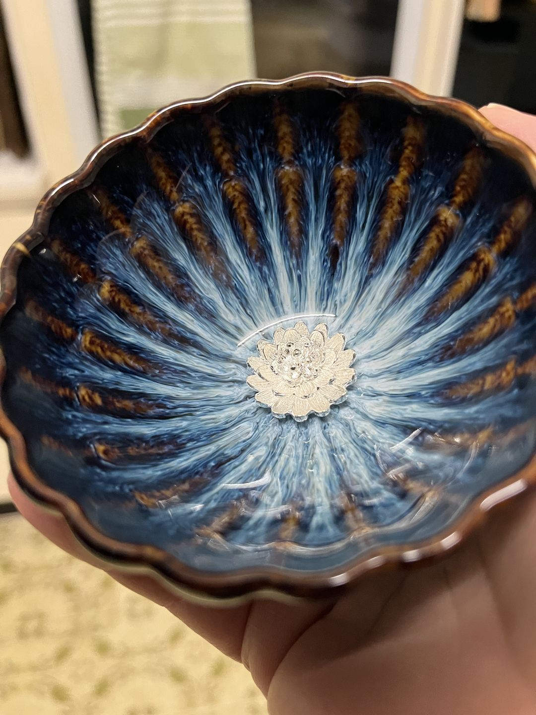 I’ve been using this cup nearly every day for the past year, and I’m just as enchanted by it now as I was when I first received it. It’s incredibly stunning. This cup is fully vitrified and won’t impart the same taste-enhancing qualities as unsealed Jianzhan cups, so if you prefer a more neutral taste, this is an excellent choice. The craftsmanship is exceptional – this cup is flawless, as are all the cups I’ve acquired from Tenmokus so far. It’s worth mentioning that tea oils gradually coat the surface of the silver lotus blossom, giving it a beautifully rich golden hue over time. Cleaning this cup has never been an issue – the lotus blossom rarely traps tiny tea particles underneath, and when it does, they are easily rinsed away with cold water
