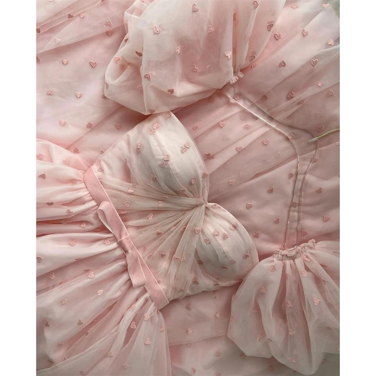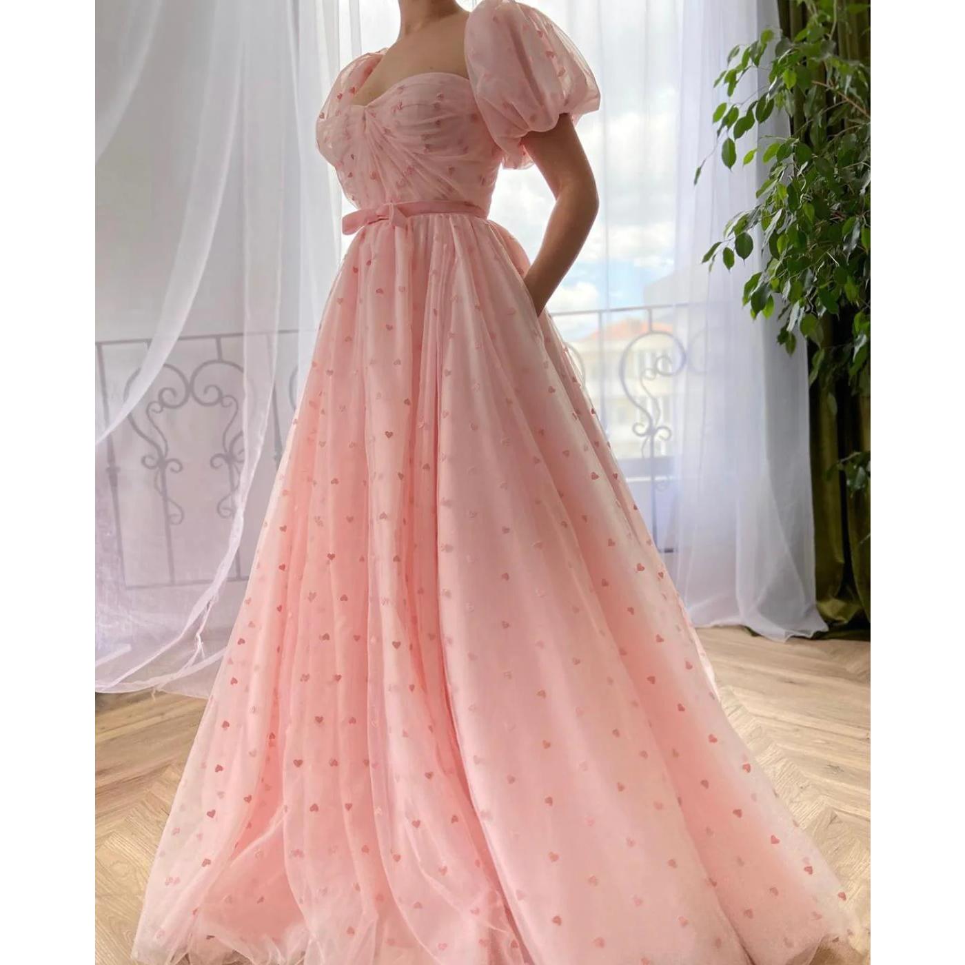 Step into a world where fashion meets fairy tale with our Pink Heart Tulle A-Line Prom Dress. Crafted with love and attention to detail, this dress is designed to make you the centerpiece of any event. Whether it’s a prom, wedding party, or a special birthday celebration, this dress ensures you look stunningly unforgettable. Its sweetheart neckline, short puff sleeves, and delicate A-line silhouette come together to create a look that’s both timeless and captivating.
