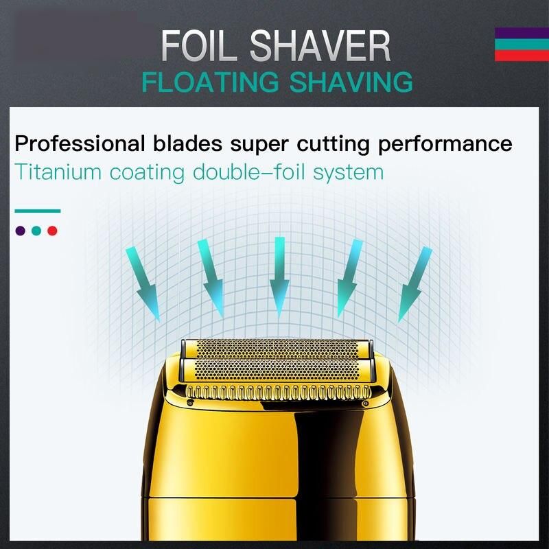 The shaver boasts a sleek, golden body that exudes understated luxury. Its compact design makes it an ideal travel companion, fitting perfectly in your grooming kit. Experience the comfort of floating shaving with professional blades that offer superior cutting performance. The titanium-coated double-foil system ensures a close, efficient shave, whether you’re tending to your beard or hair. With the convenience of a USB charging cable, your shaver is always ready when you are, complemented by a LED digital display for easy monitoring of battery life.